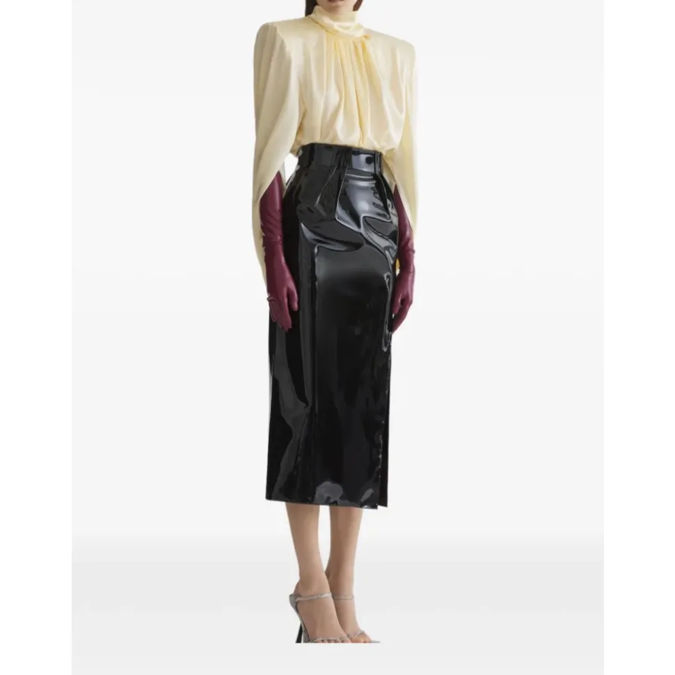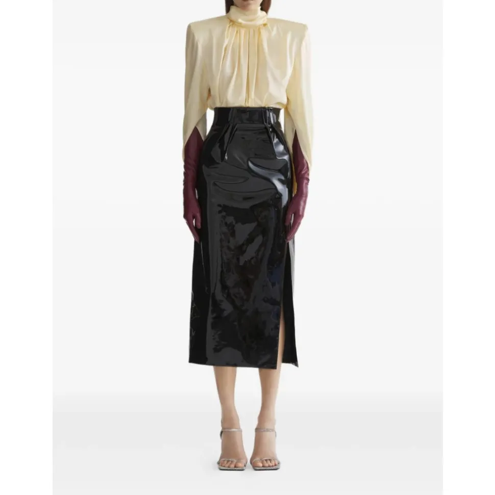 Mugler Toppen kombinerer en høj hals med lysegule draperede detaljer og en skjult lukning, hvilket giver en raffineret bluse til både elegante dags- og aftenlooks. Nøgleattributter: Gul | Hvid | Skjult lukning | Høj hals | Lysegule draperede detaljer