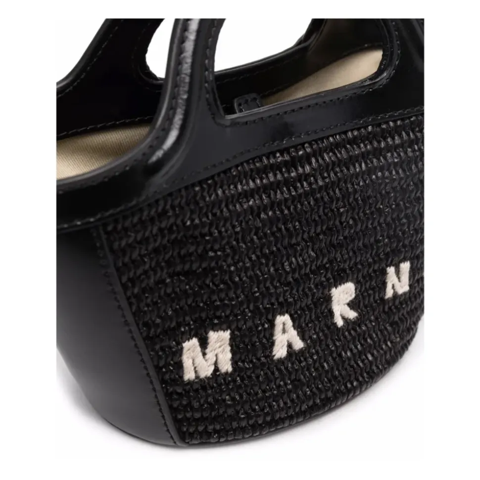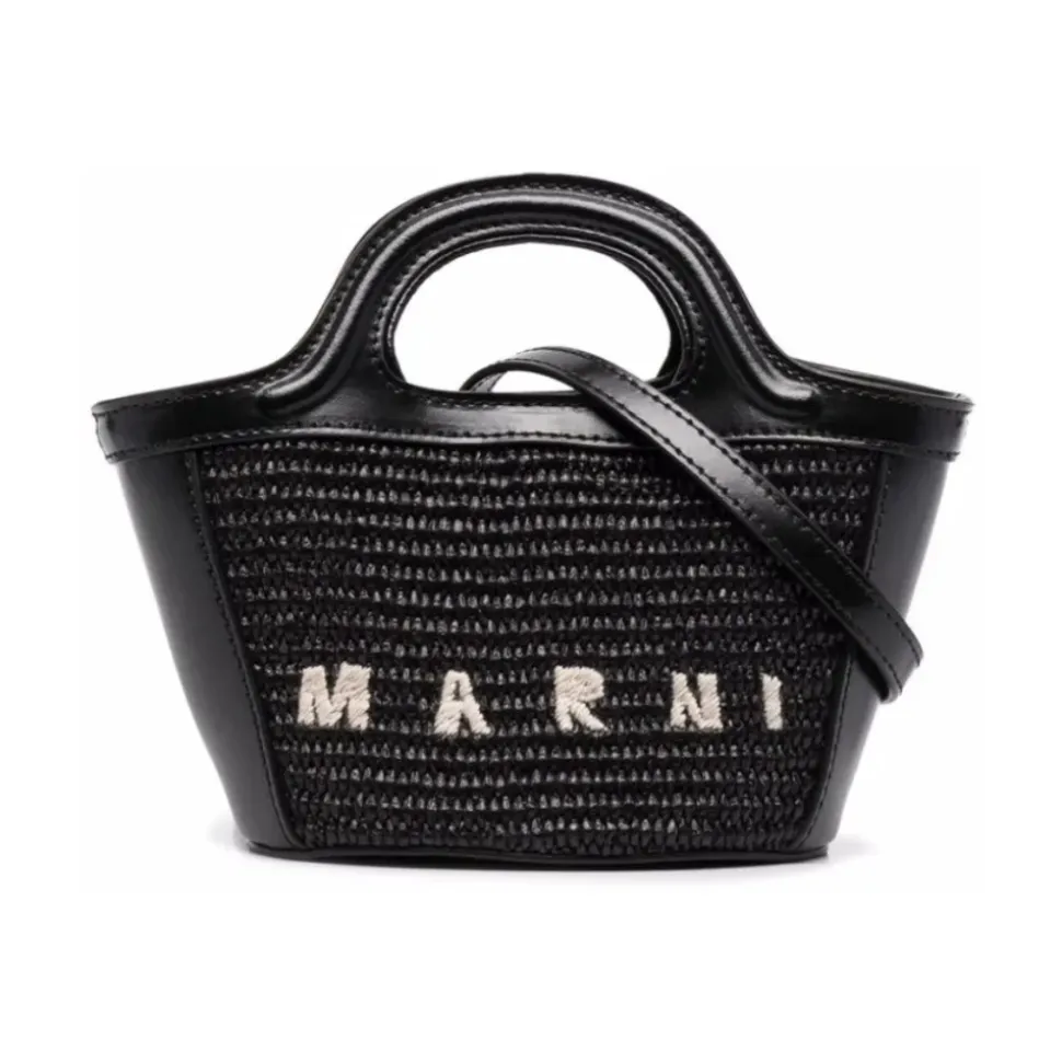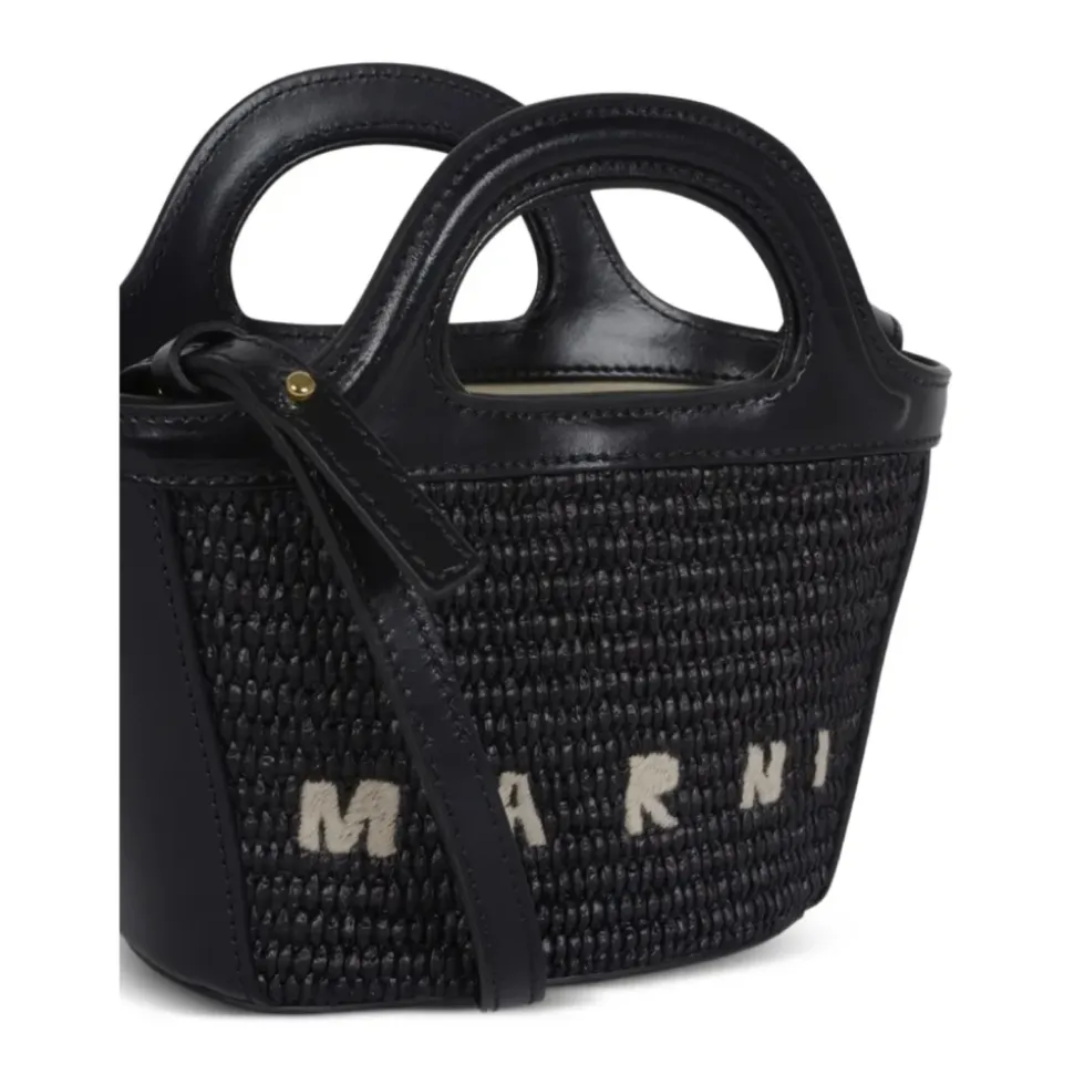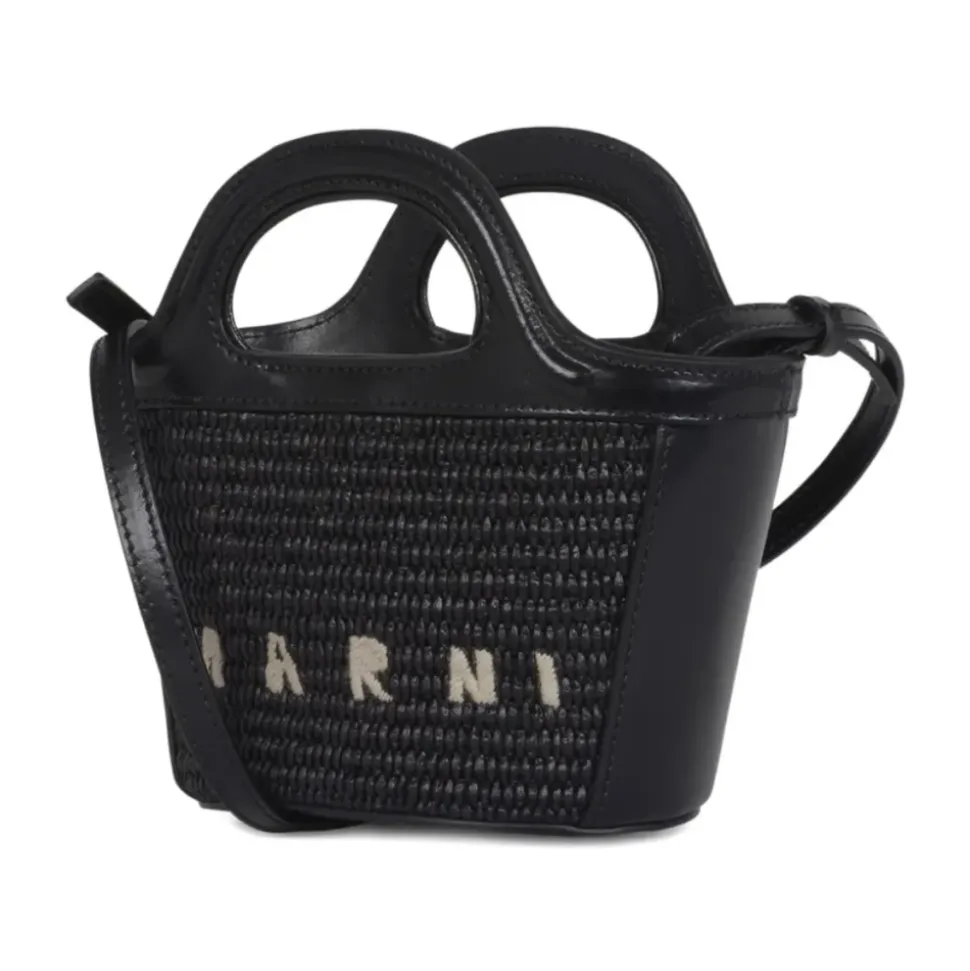 Marni Tropicalia Micro er en kompakt, struktureret mini taske designet til håndfri alsidighed. Designet kombinerer læderdetaljer med raffia-effekt paneler og en aftagelig skulderrem til brug fra dag til aften. Vigtigste egenskaber: Sort | Læder | Aftagelig skulderrem | To tophåndtag | Tab-lukning ved åben top | Raffia-effekt paneler | Logo broderi | Struktureret silhuet | Tophåndtag | Dimensioner og pasform: One size | Sammensætning og pleje: Krop: 52% bomuld, 48% polyamid | Kontrast: 100% kalvelæder | Foring: 95% bomuld, 5% akryl | Undgå at udsætte læderet for ru overflader. Hvis det udsættes for regn, tørres det straks med en blød, tør klud. Rengør med en blød, tør klud og undgå alkoholbaserede produkter, cremer eller rengøringsmidler.