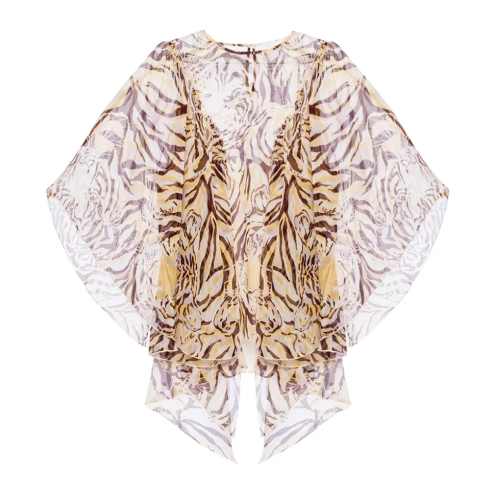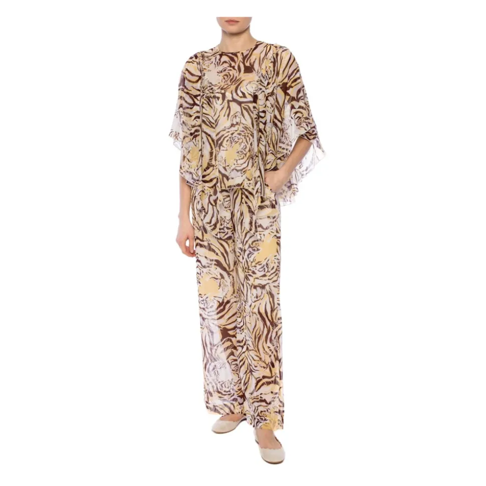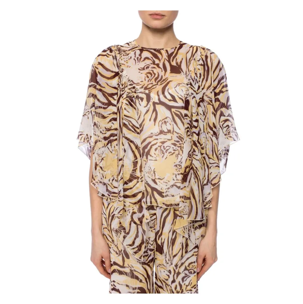Gennemsigtig top i gul, brun og lyserød fra See By Chloé. Dekoreret med rynker og et trykt tigerhovedmotiv. Rund halsudskæring.