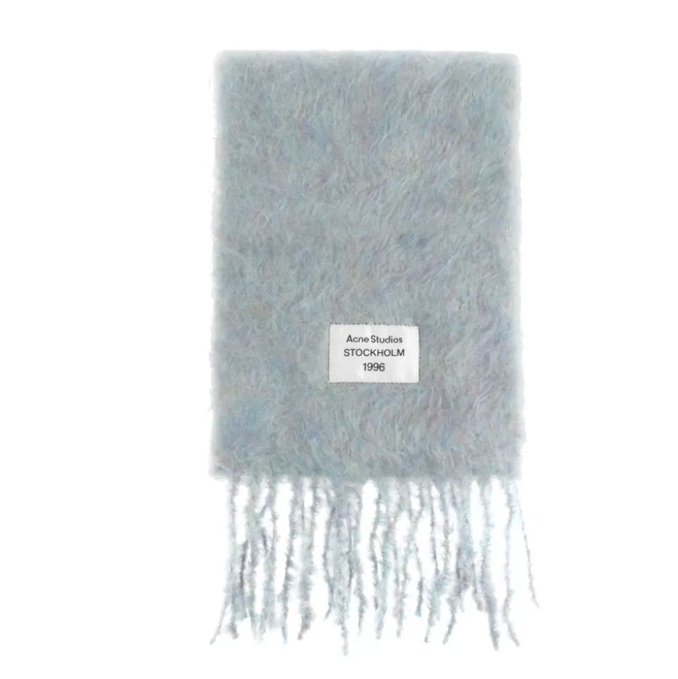 Acne Studios uldtørklæde med logo kombinerer en blød mohairblanding med et minimalistisk logomærke for raffineret, hverdagsvarme. Dets lange rektangulære form og tætte frynser gør det ideelt til lagdelt vinterstyling. Vigtige egenskaber: Lyseblå | Blå | Mohair | Blødt og varmt | Fuzzy børstet tekstur | Frynser i enderne | Logomærke detalje | Rektangulær aflang form | Tætte frynser i enderne | Melange tekstur | Hvidt logomærke | Dimensioner & pasform: Bredde: 27 cm | Længde: 227 cm | One size | Sammensætning & pleje: 71% Mohair | 21% Uld | 8% Nylon