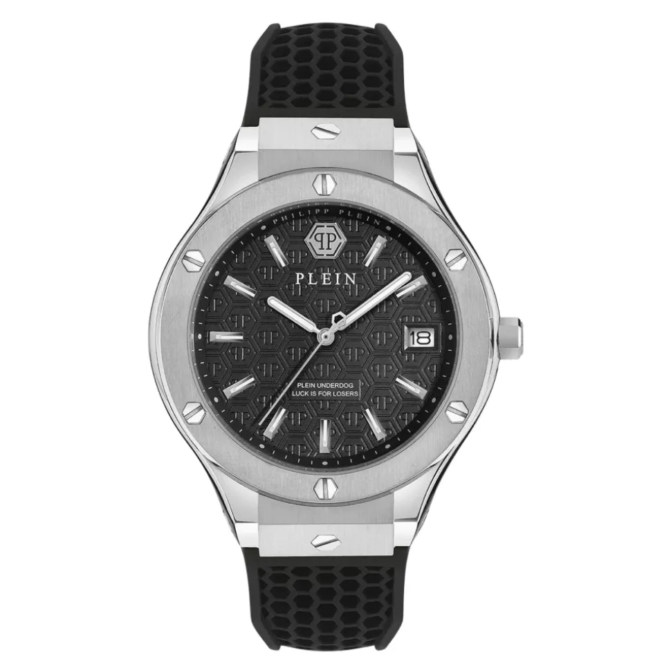 Philipp Plein Underdog fra Philipp Plein er et dristigt statement-ur, der kombinerer robust konstruktion med et markant sort og sølv look. Ideelt til hverdagsbrug, det kombinerer et rustfrit stål urkasse med en komfortabel silikonerem. Nøgleattributter: Sort | Schwarz | Rustfrit stål | Miyota quartz urværk | Ridsesikkert mineralglas | 5 ATM vandtæthed | Komfortabel silikonerem | Holdbar konstruktion | Sølvfarvet urkasse i rustfrit stål | Dristigt statement design | Sammensætning og pleje: Rustfrit stål | Silikone | Mineralglas | Miyota quartz urværk