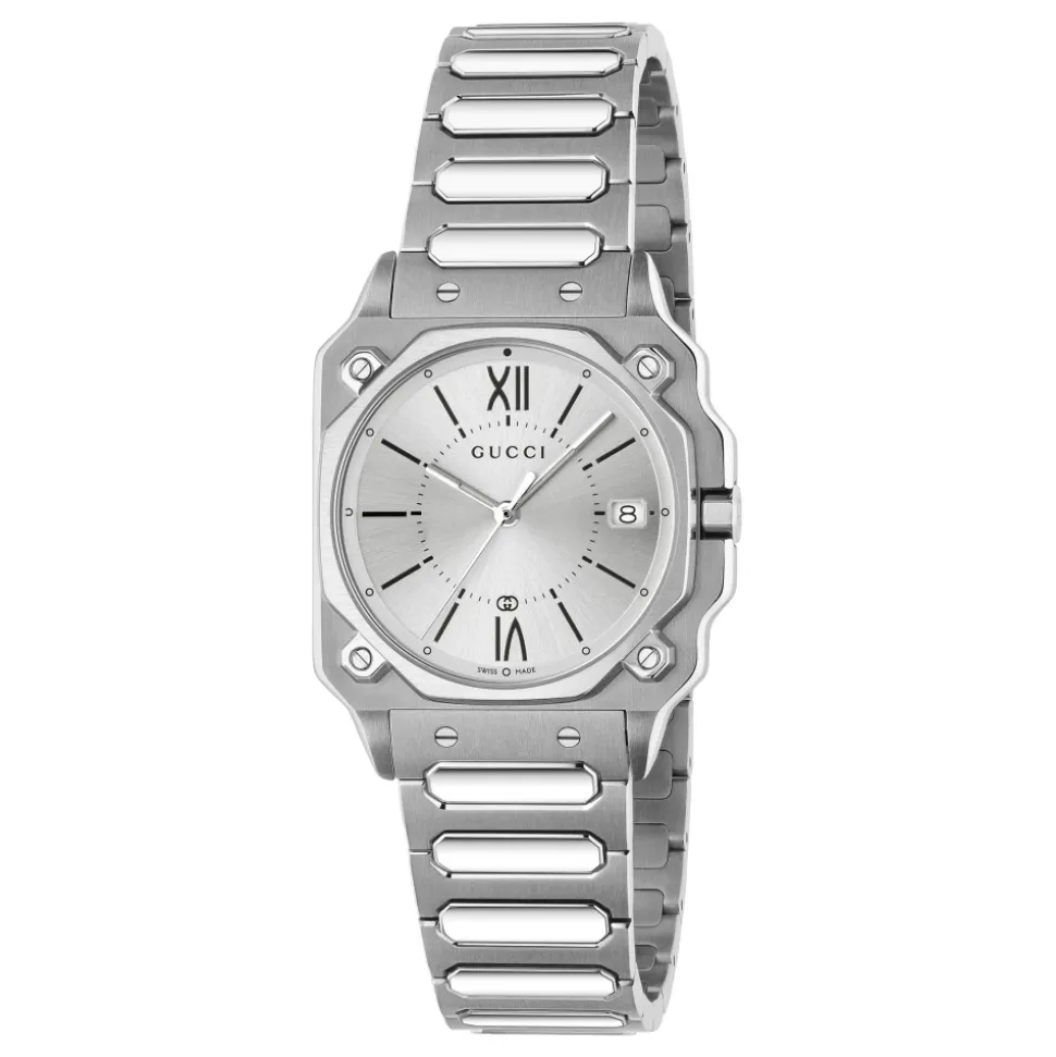 Forøg din stil med dette Gucci-ur til kvinder. Med en rem af rustfrit stål og safirglas er dette tilbehør både elegant og holdbart. Vandafvisende op til 5 ATM (50 meter/164 fod).