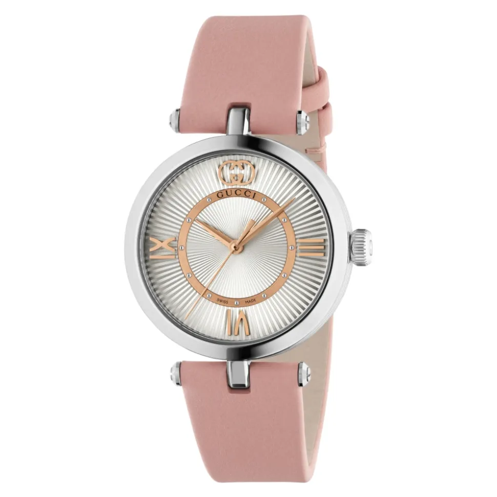 Forkæl dig selv med dette Gucci-ur til kvinder. Med safirglas og læderrem er dette tilbehør både elegant og holdbart. Vandafvisende op til 5 ATM (50 meter/164 fod).