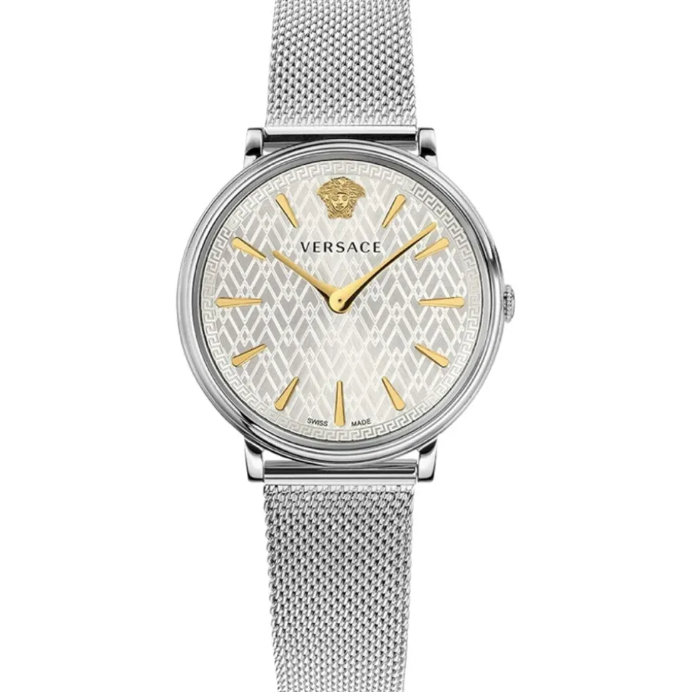 Versace V Circle Watch kombinerer poleret rustfrit stål med safirglas for et raffineret hverdags-accessory. Dens holdbare konstruktion og præcise quartz-urværk gør den velegnet til kontorbrug, aftener i byen og specielle lejligheder. Nøgleattributter: Grå | Sølv | Rustfrit stål | Vandafvisende til 5 bar | Ridsefast safirglas | Quartz-urværk | Armbånd i rustfrit stål | Poleret finish i rustfrit stål | Tidløst elegant design | Sammensætning & pleje: Rustfrit stål | Safirglas