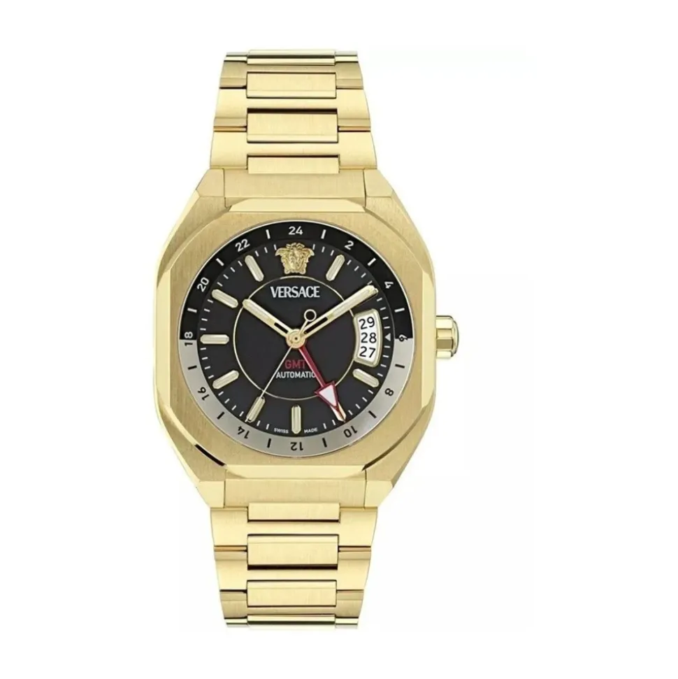 Versace V-Contempo Automatiske Ur kombinerer et guldfarvet rustfrit stålurhus og -armbånd med en sort urskive og safirkrystal. Det har et automatisk urværk med GMT- og datofunktioner til alsidig hverdags- og formel brug. Nøgleattributter: Gul | Guld | Sort | Rustfrit stål | Vandafvisende | Safirkrystal | Automatisk urværk | GMT-funktion | Datovisning | Guldfarvet rustfrit stålurhus og -armbånd | Sort urskive | GMT-skala | Dimensioner og pasform: Egnet til hverdags- og formelle lejligheder | Sammensætning og pleje: Rustfrit stål | Safirkrystal | Tør af med en blød klud. Undgå udsættelse for stærke kemikalier og ekstreme temperaturer. Få urværket serviceret af en professionel urmager med anbefalede intervaller.