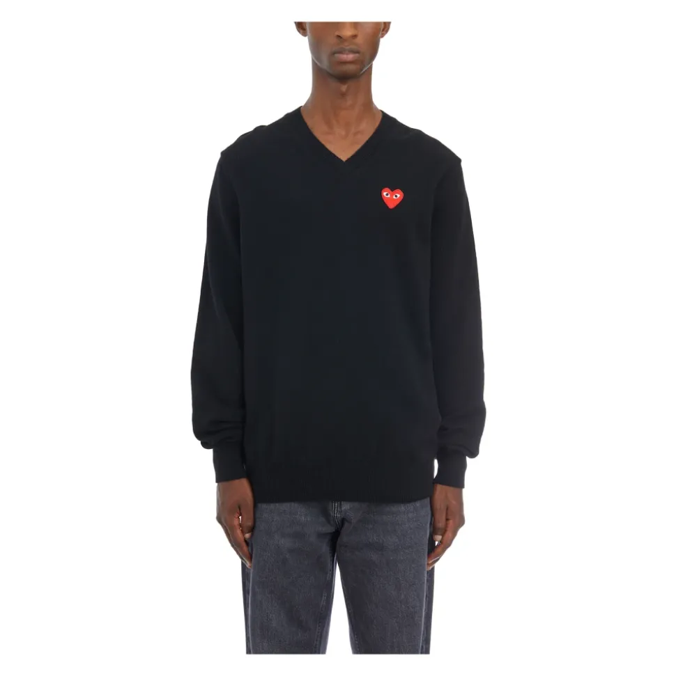 Opgrader din afslappede garderobe med V-Neck Logo Tee fra Comme des Garçons Play. Denne sweatshirt har et klassisk v-hals design og det ikoniske Play-logo, hvilket giver en stilfuld og komfortabel mulighed til hverdagsbrug. Produkt detaljer: Sort | V-udskæring | Ikonisk Play-logo |