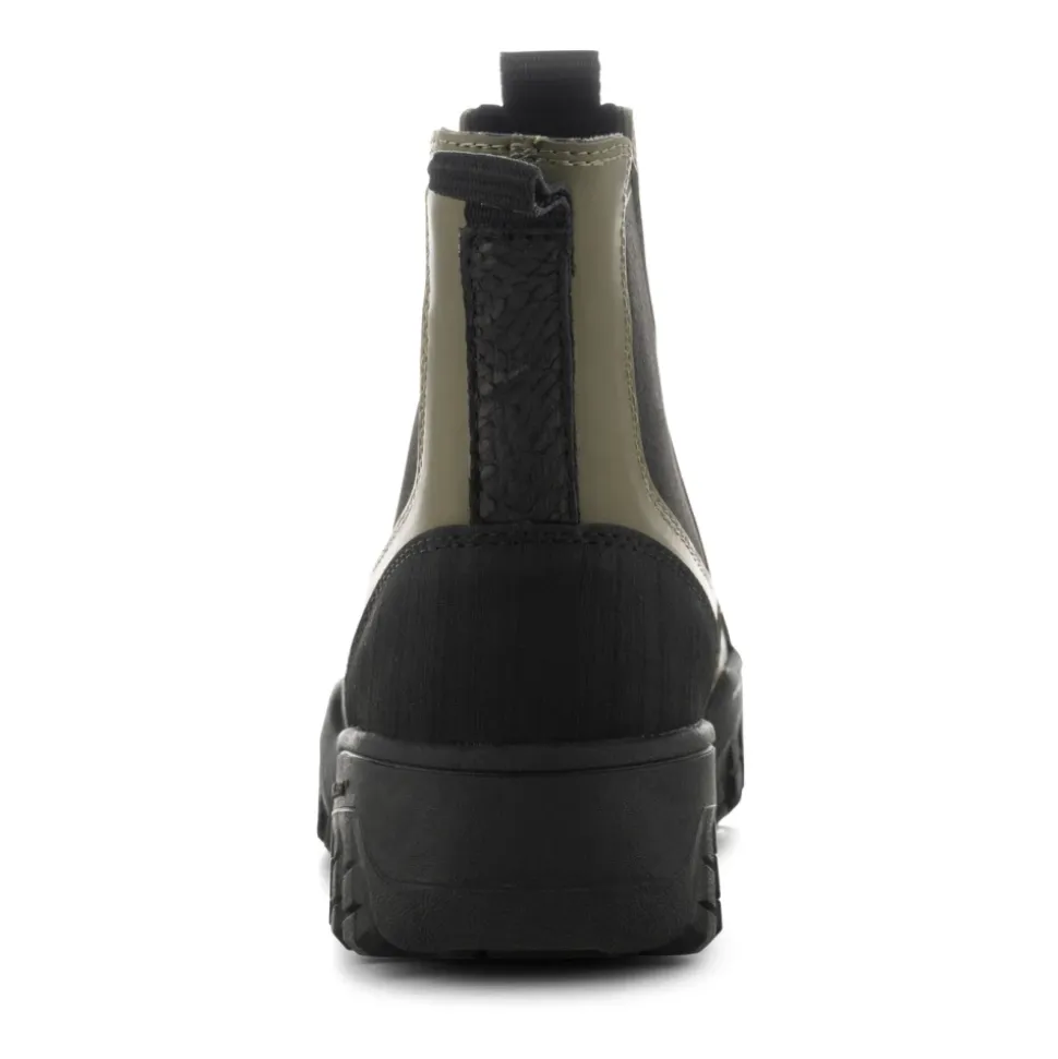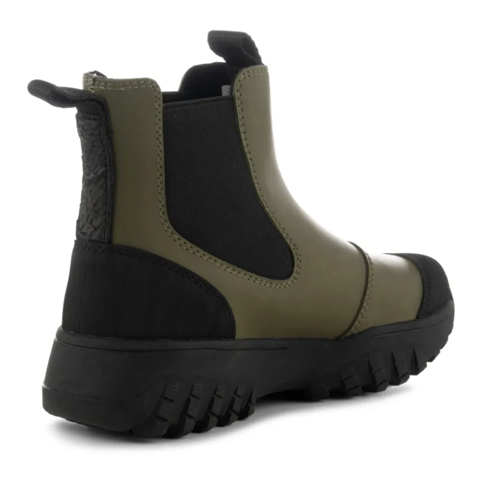 Oplev Magda Track, en slidstærk, vandtæt Chelsea støvle fra Woden, fremstillet med 70% naturgummi og unikke fiskelæderdetaljer. Ideel til rejser, disse støvler sikrer komfort og stil. Produkt detaljer: Mørk Oliven | Grøn | Naturgummi | Vandtæt | Åndbar | Letvægt | Stødabsorberende | Fiskelæderhæl | Signatur ydersål | Dimensioner og pasform: Almindelig pasform | Sammensætning og pleje: 70% Naturgummi | 30% Gummi | Aftørres med en fugtig klud