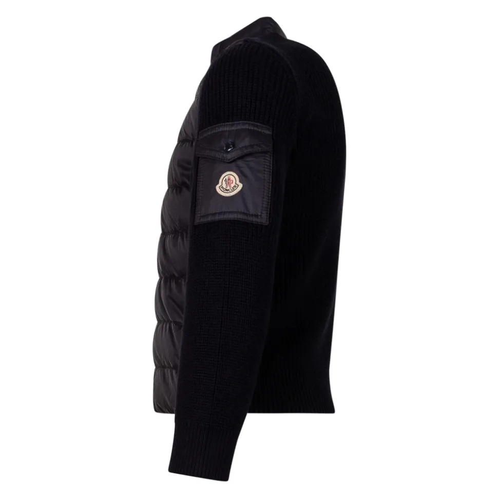 Moncler vatteret cardigan med lynlås i bomuld kombinerer blød strik med en dunforet front for at give let isolering og behagelig varme. Vigtige egenskaber: Marineblå | Bomuld | Isolerende dunforet front | Mellemvægt strik for let varme | Lynlåslukning | Ærmelomme | Ribstrikket krave, manchetter og kant | Gauge 7 mellemvægt strik | Dunforet nylonfront | Sammensætning og pleje: Basiskvalitet: 100% bomuld | Yderstof front: 100% polyamid (nylon) | Krave: 100% polyamid (nylon) | Frontfor: 100% bomuld | Kravefor: 100% polyamid (nylon) | Vattering: 90% dun, 10% fjer | Detaljer vattering: 100% polyester | Håndvask; Må ikke bleges; Må ikke tørretumbles; Stryges ved max 110°C uden d Må ikke renses; Må ikke professionelt vådrenses; Tørres fladt i skyggen.