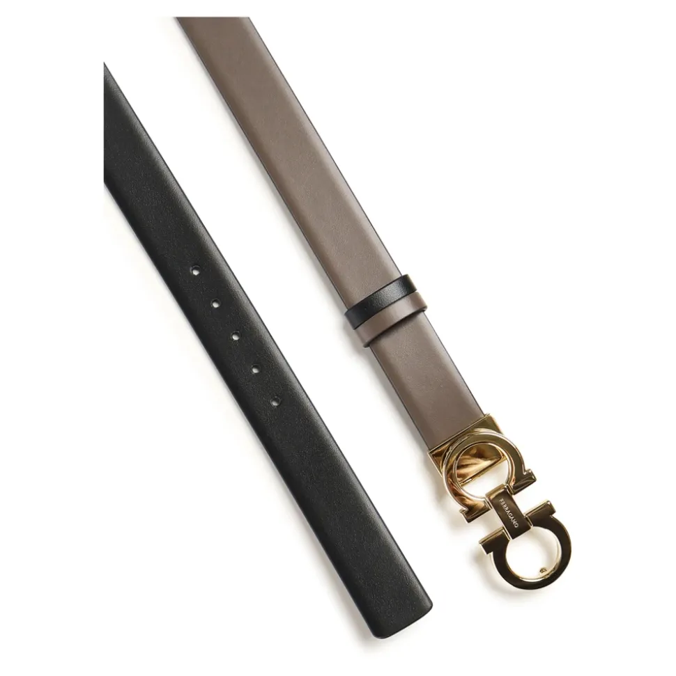 Forhøj din stil med dette Ferragamo bælte til kvinder, der er vendbart og justerbart, lavet af kalveskind i Italien. Med en dobbelt Gancini spænde er dette bælte både alsidigt og elegant. Fås i brun og sort.
