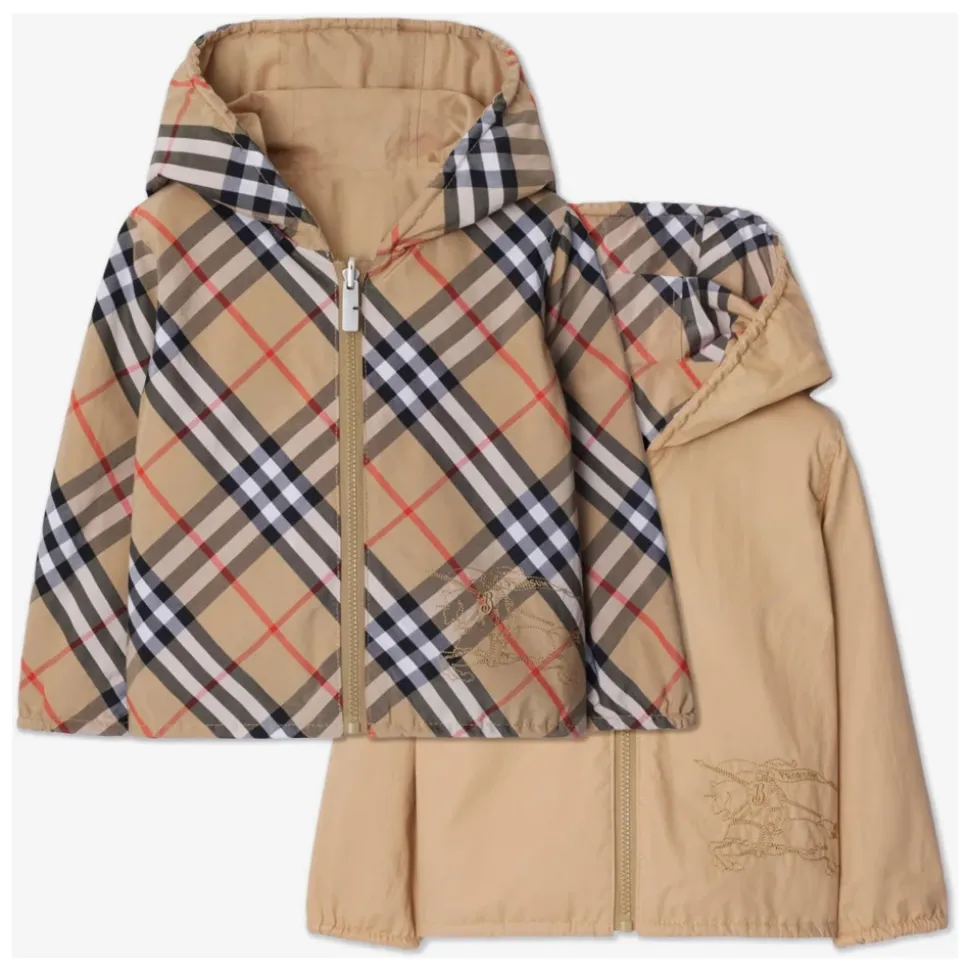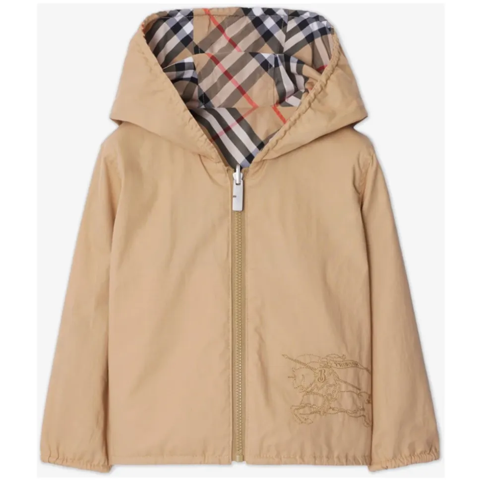 Klæd din lille herre stilfuldt på med denne Burberry Rufus sand check korte jakke. Fremstillet med praktisk elegance og håndværk af høj kvalitet, denne vendbare jakke har det ikoniske Burberry-ternemønster på den ene side og et udsmykket EKD-riddermotiv. Lavet af en bomuldsblanding med lynlås, klassisk hætte og tonal syning. Perfekt til at tilføje et strejf af sofistikation til hans outfit.