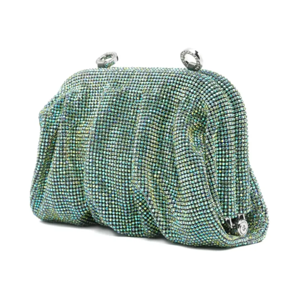 Benedetta Bruzziches Venus La Petite er en hånddekoreret aften-clutch designet til at fungere som et juvel-lignende tilbehør til aftener i byen. Dens krystalbesatte aluminiumsnet og satinpung tilbyder kompakt opbevaring med iøjnefaldende glans. Nøgleattributter: Grøn | Blå | Aluminiumnet | Aftagelig metal kædestrop | Hængsel-struktureret fuldt åbnende top | Satin inderpose | Ingen inderlommer | Krystal-rhinsten udsmykning | Bølget rynket silhuet | Håndsyede detaljer | Aften-clutch form | Mål & pasform: H: 12 cm | B: 22 cm | D: 5.5 cm | Sammensætning & pleje: Eksternt: 100% aluminiumsnet besat med krystalrhinsten | Internt: 100% silke satinpose | Tør af med en blød klud.