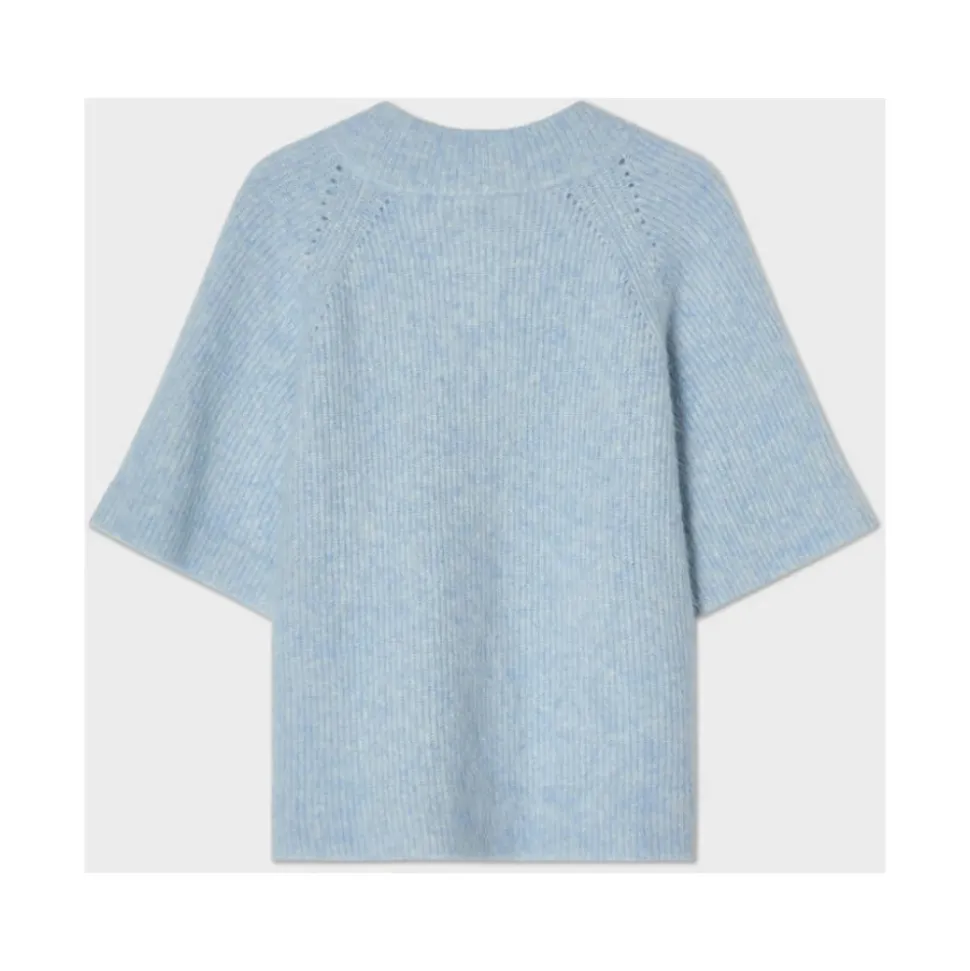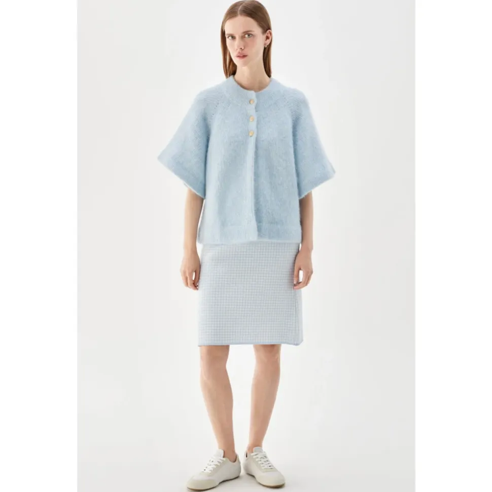 Busnels Vilanie kortærmede Mohair Cardigan er en cape-inspireret strik, der kombinerer en blød, fluffy mohair-uldtekstur med en skulpturel silhuet. Den er designet til nem lagdeling og til at tilføje et raffineret, feminint touch til outfits. Vigtigste egenskaber: Blå | Isblå | Mohair og uld | Topknaplukning | Kan lagdeles over oversized skjorter | Cape-inspireret silhuet | Rund halsudskæring | Korte flæseærmer | Fluffy, blød tekstur | Tre gyldne B-knapper foroven | Mål og pasform: Normal i størrelsen | Modellen er 175 cm høj og bærer størrelse 38 | Sammensætning og pleje: 33% mohair, 33% uld, 28% nylon, 6% elastan | Håndvask