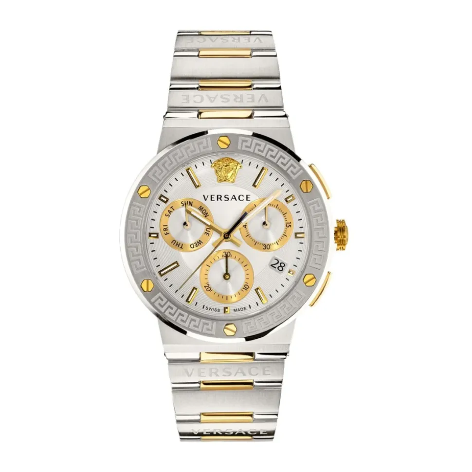 Versace Watch Greca Logo Chr kombinerer det ikoniske Greca-logo med en 43 mm urkasse i rustfrit stål for et markant og iøjnefaldende ur. Nøgleattributter: Flerfarvet | Guld | Rustfrit stål | IP1N-belagt urkasse | Kronograffunktion | Greca-logo motiv | Dimensioner og pasform: Urkassediameter: 43 mm | Sammensætning og pleje: Rustfrit stål