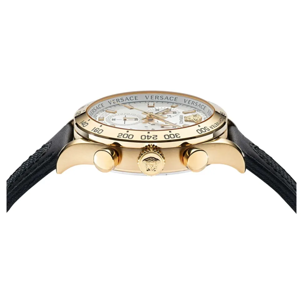 Versace ur med en guldfarvet urkasse i rustfrit stål, hvid urskive og sort læderrem. Det kombinerer safirkrystalbeskyttelse med tre subdials og kvartspræcision for pålidelig hverdagsbrug. Nøgleattributter: Gul | Guld | Rustfrit stål | Vandafvisende til 5 Bar | Safirkrystal | Kvarts urværk | Læderrem | Tre subdials | Guldfarvet urkasse | Hvid urskive | Sort læderrem | Sammensætning & pleje: Rustfrit stål | Læder | Safirkrystal