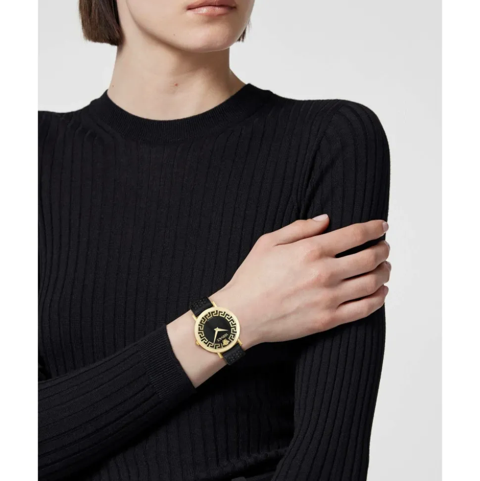 Versace ur med en sort urskive og guldfarvet urkasse, beskyttet af safirglas til daglig brug. Uret bruger et quartz urværk og er vandafvisende op til 5 Bar. Vigtige egenskaber: Sort | Schwarz | Quartz urværk | Vandafvisende op til 5 Bar | Safirglas | Sort urskive | Guldfarvet urkasse | Sort rem | Safirglas der beskytter urskiven