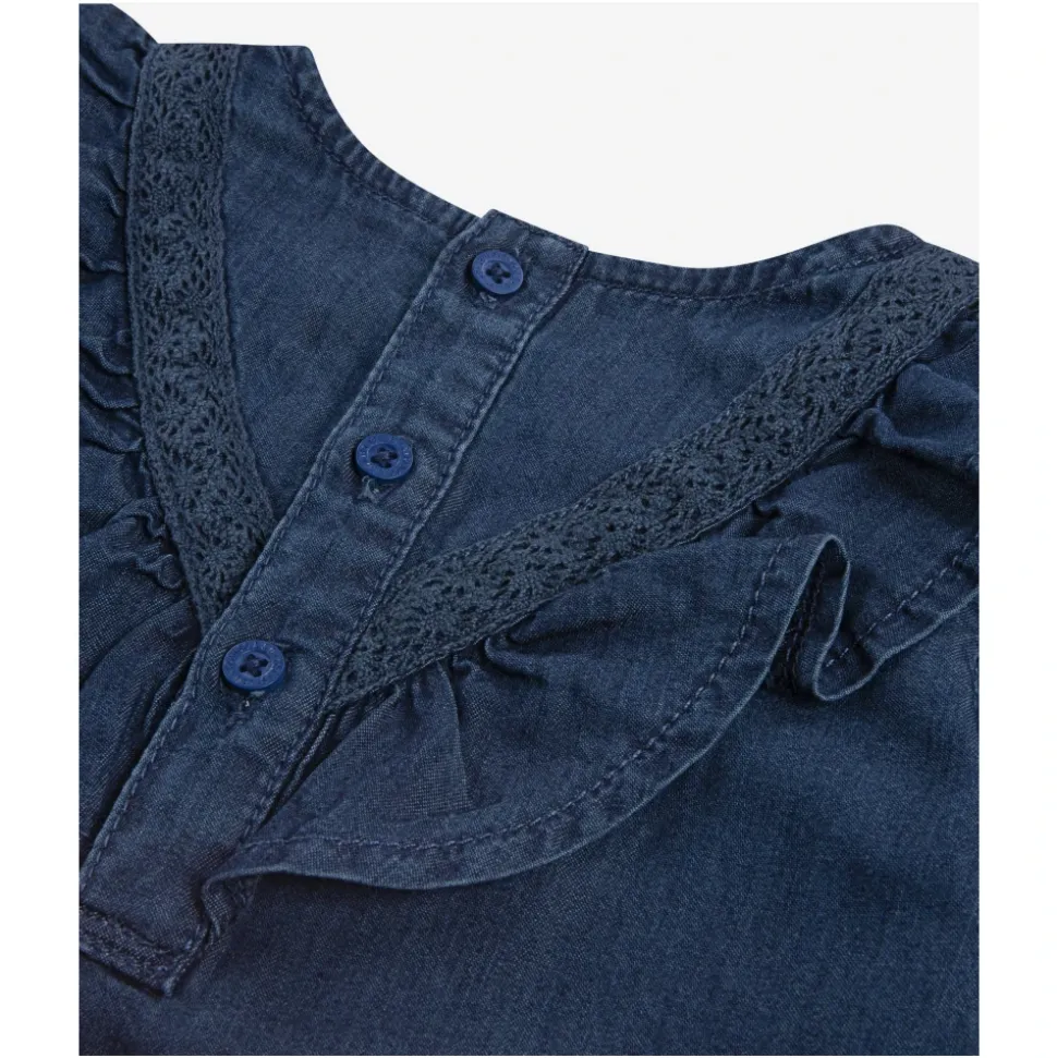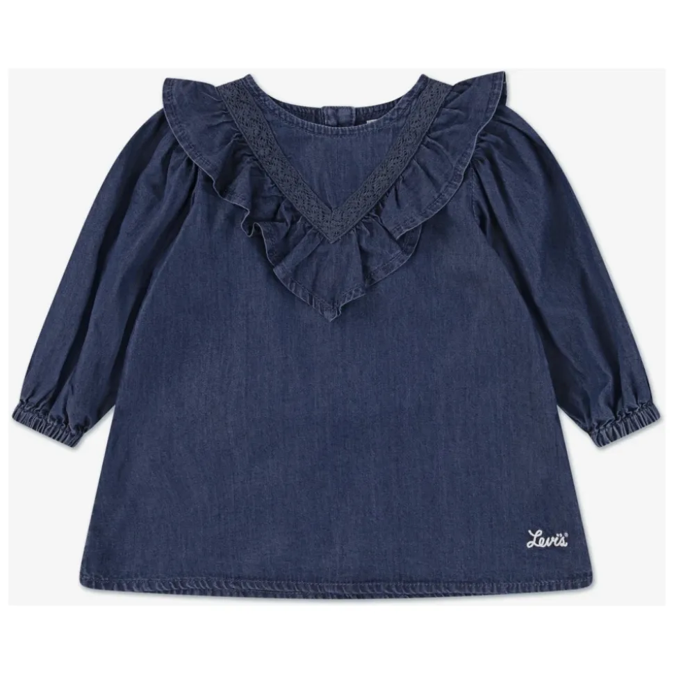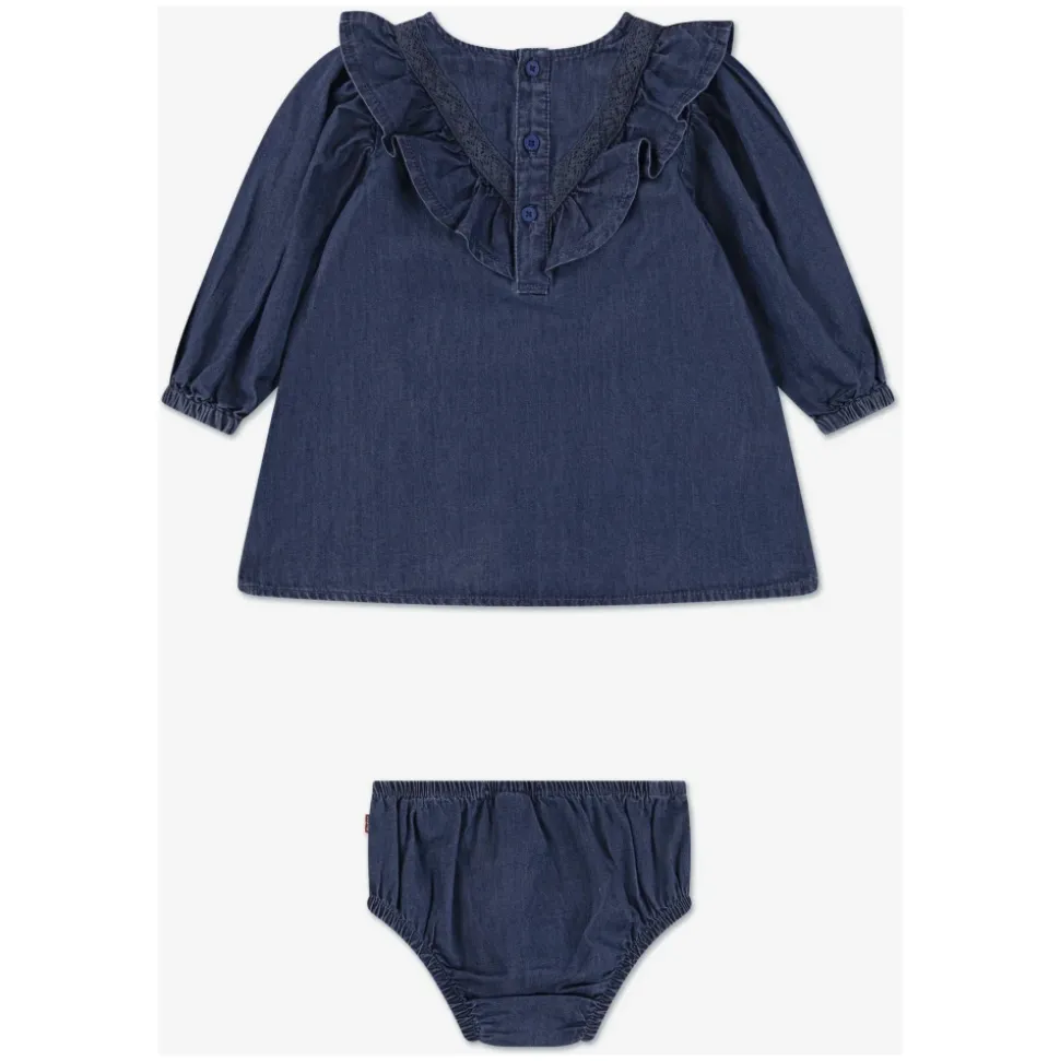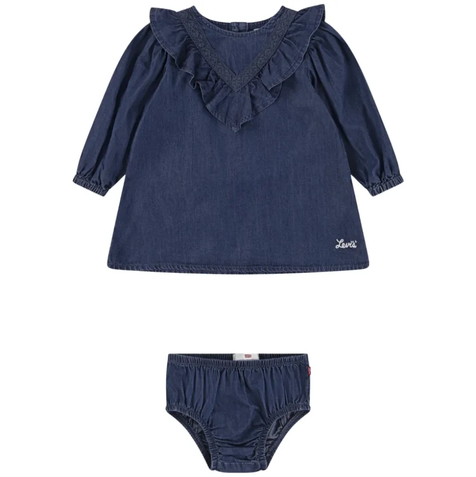 Levi’s Wild West Ruffle Dress & Bloomers Set kombinerer denim-inspireret styling med blød bomuldskonstruktion. Sættet har en flæsekrave og matchende bloomers til hverdagsbrug og fotoklare øjeblikke. Vigtigste egenskaber: Blå | Bomuld | Blødt, åndbart stof | Inkluderer matchende bloomers | Knaplukning foran | Flæseformet V-krave | Lange klokkeærmer med rynkede manchetter | A-formet skørt | Blondedetaljer og flæser | Sammensætning og pleje: 100% bomuld | Maskinvask, tørretumbling; vask med vrangen ud med lignende farver.