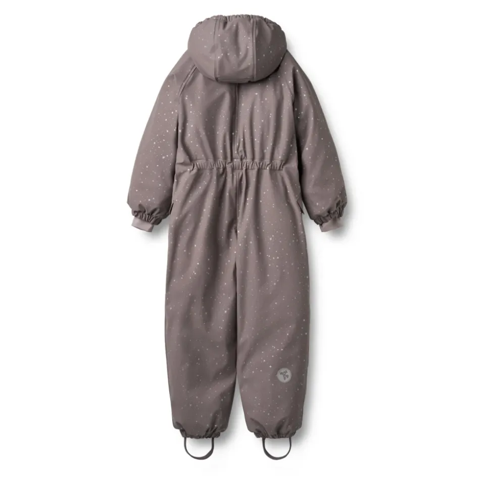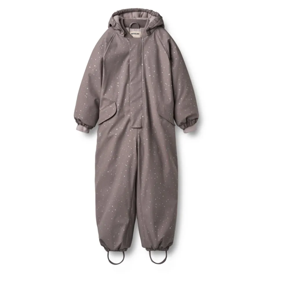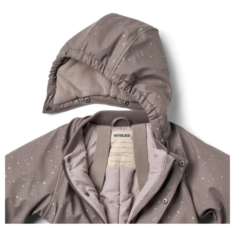 Wheat Wintersuit Ludo er en vatteret vinterdragt, der kombinerer vandtæt beskyttelse med åndbar isolering til kolde, våde forhold. Praktiske detaljer – som en aftagelig hætte, elastiske seler og forstærkede manchetter – gør det nemt at klæde sig på og lege udendørs. Vigtige egenskaber: Brun | Lilla stenstjerner | Polyester | Vandtæt (9.000 mm vandsøjletryk) | Åndbar (600 g/m2/24 t) | Isoleret til koldt vejr | Tapede sømme og vandtæt lynlås | Aftagelig og justerbar hætte | Elastiske, indsyede seler | Lommer med trykknapper | Skjult lynlås foran | Aftagelige fodstropper i gummi | Vindfang med tommelfingerhul og elastik ved håndled | Elastik ved ankler | Refleksdetaljer | All-over sølvstjerne- og prikprint | Quiltet foring | Ribkrave | Mål og pasform: Regular fit | Sammensætning og pleje: Yderstof: 100% polyester (PU-belægning) | Isolering: 100% polyester | Quiltet foring: 100% polyester | Maskinvask 30°C skånsomt; må ikke tørretumbles; følg produktets vaskeanvisninger.