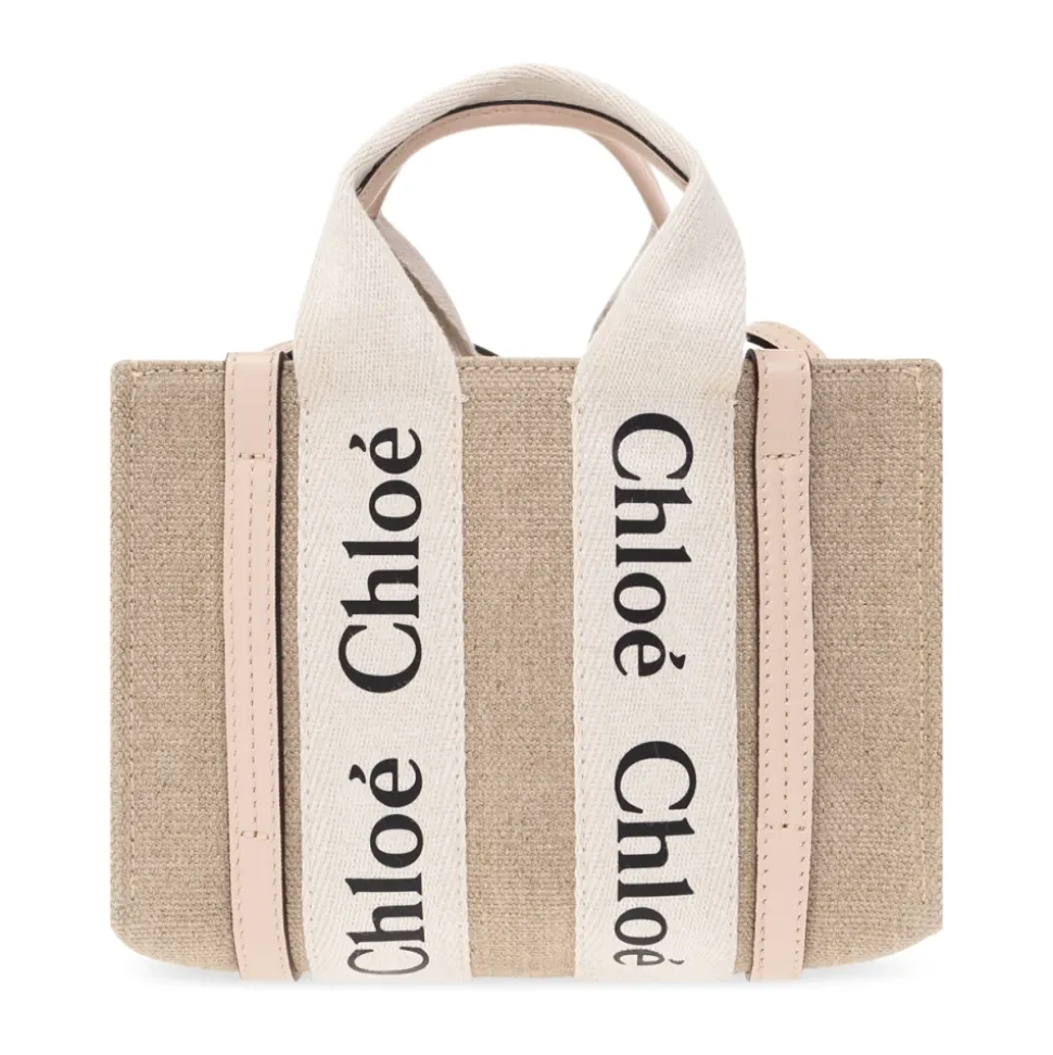 Beige og grå ‘Woody Mini’ shopper taske fra Chloe. Lavet af linned og kantet med lyserød kalveskind, dette design viser en trykt sort logo, to halvrunde håndtag, en lang rem og et internt rum med en slip lomme. Højde: 14 cm Bredde: 20 cm Modelens målinger Højde: 177 cm Buste: 83 cm Talje: 61 cm Hofter: 89 cm