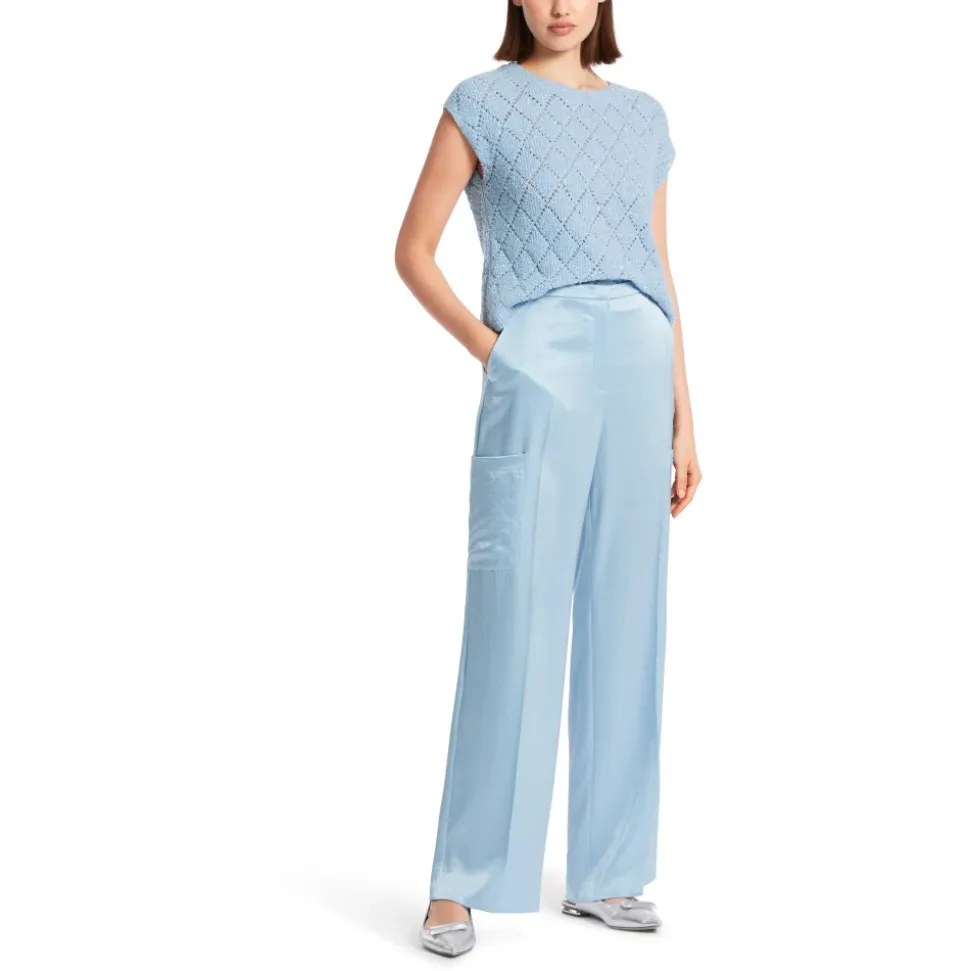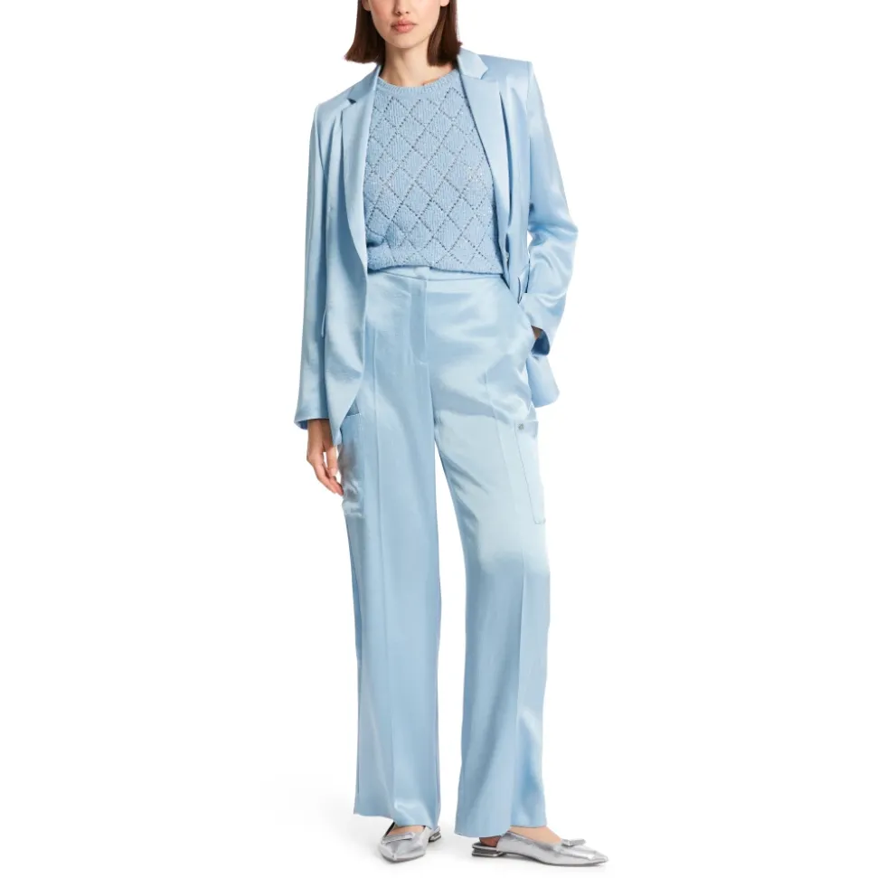 Marc Cain WUKARI bukser har brede, ekstra lange ben i et blødt skinnende, flydende stof for en afslappet, men poleret silhuet. De passer til smarte, afslappede og løftede hverdagslooks. Vigtige egenskaber: Blå | Blød sommerhimmel | Triacetat | Lynlås- og hægtelukning | Cargolommer | Sidelommer | Paspolerede baglommer | Bredt, ekstra langt ben | Fin glans | Pressefolder foran | Mål og pasform: Benlængde: 86.36 cm | Modelhøjde: 179 cm; iført størrelse N3/38 | Bred pasform | Høj talje | Ekstra langt ben | Sammensætning og pleje: 86% triacetat, 14% polyester | Vask 30°C (skånsom); må ikke bleges; må ikke tørretumbles; stryges ved lav temperatur; professionel rens (perchlorætylen).