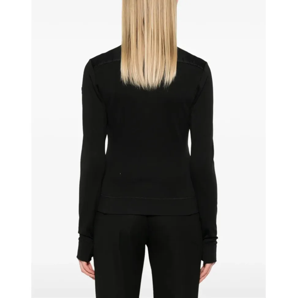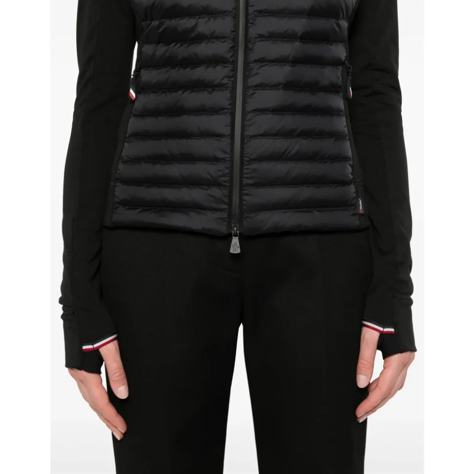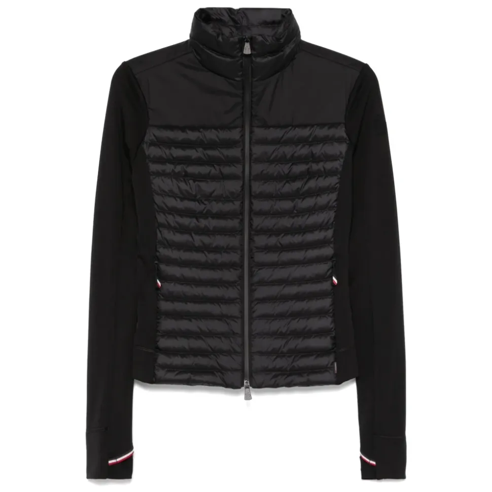 Moncler Zip Up Cardigan kombinerer delvist quiltede paneler med stretch-jersey for let varme og alsidig lagdeling. Designet er velegnet til lagdeling i køligt vejr og hverdagsbrug som overtøj. Nøgleattributter: Sort | Polyester | Isolerende quiltet panel | Stretch-jersey paneler for bevægelighed | Lynlåslukning foran | Welt-lommer foran | Ribstrikkede manchetter og kant | Høj krave | Delvist quiltet frontpanel | Lange ærmer | Logo patch på ærme | Sammensætning & pleje: 88% Polyester, 12% Elastan | Renseri